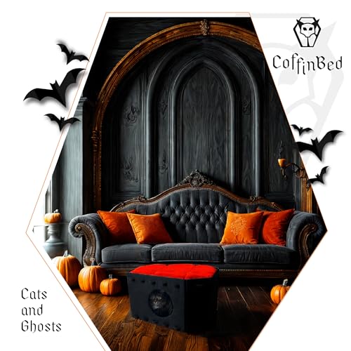 Specification: Gothic Cat Bed for Indoor Cats or Pets, Foldable as Halloween Cat House with Soft Cushion for Goth Cat, Gothic Cat House, Coffin Shape Cat Cave, Black and Red Color